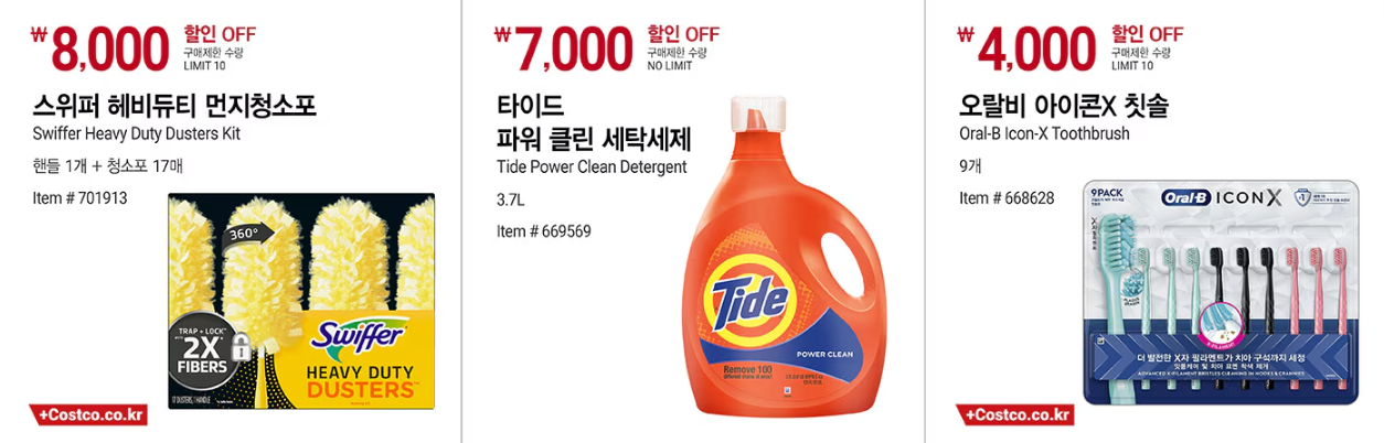 | Tide | 세탁 세제 | 대용량 세제 할인 | 세척력 강력, 경제적 사용 |