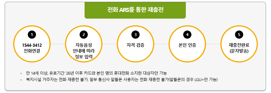 - 전화(ARS) 재충전: 1544-3412를 통해 기존 카드 재충전 가능