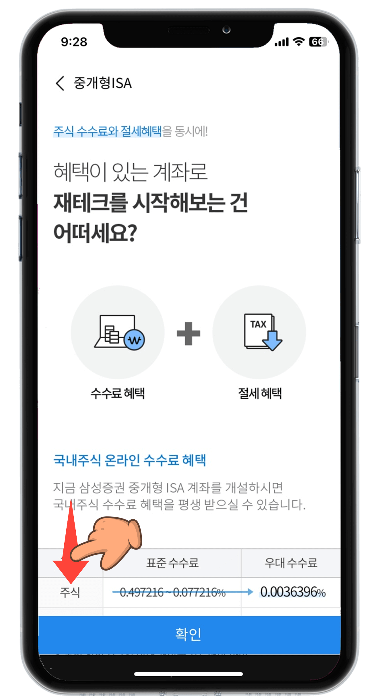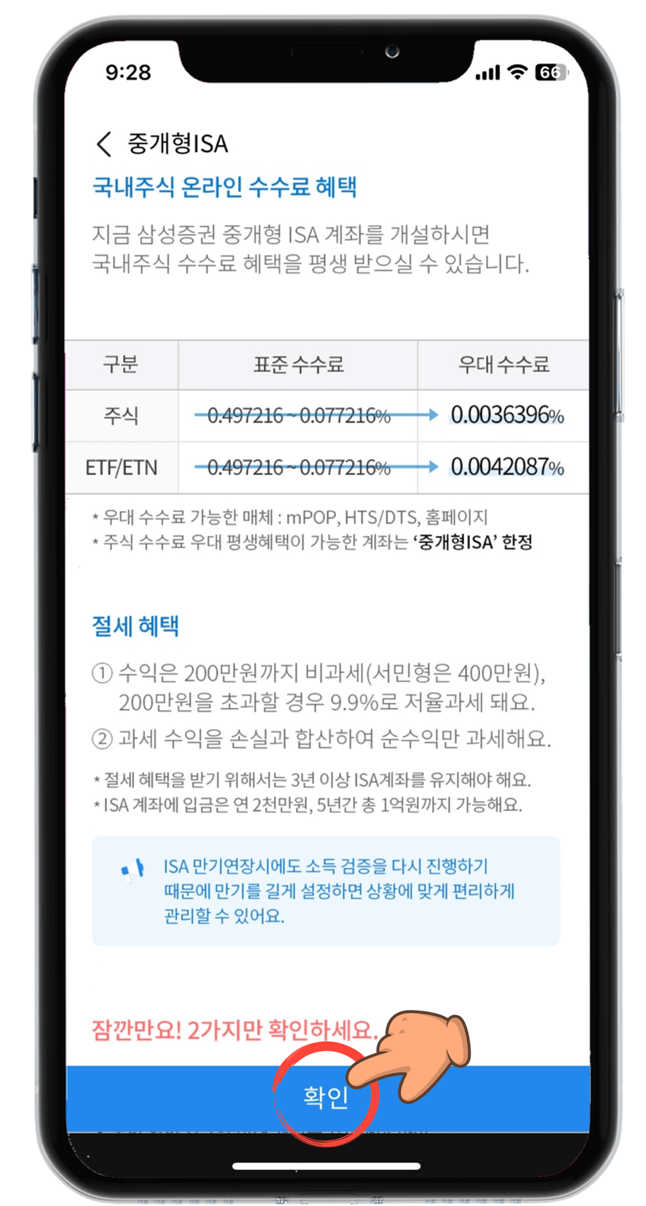 - 그다음 밑으로 내리면서 "수수료 혜택", "절세 혜택", "잠깐만요! 2가지만 확인하세요."를 꼭 읽어보시고 확인을 눌러 다음단계로 넘어가시는 것을 추천드립니다.